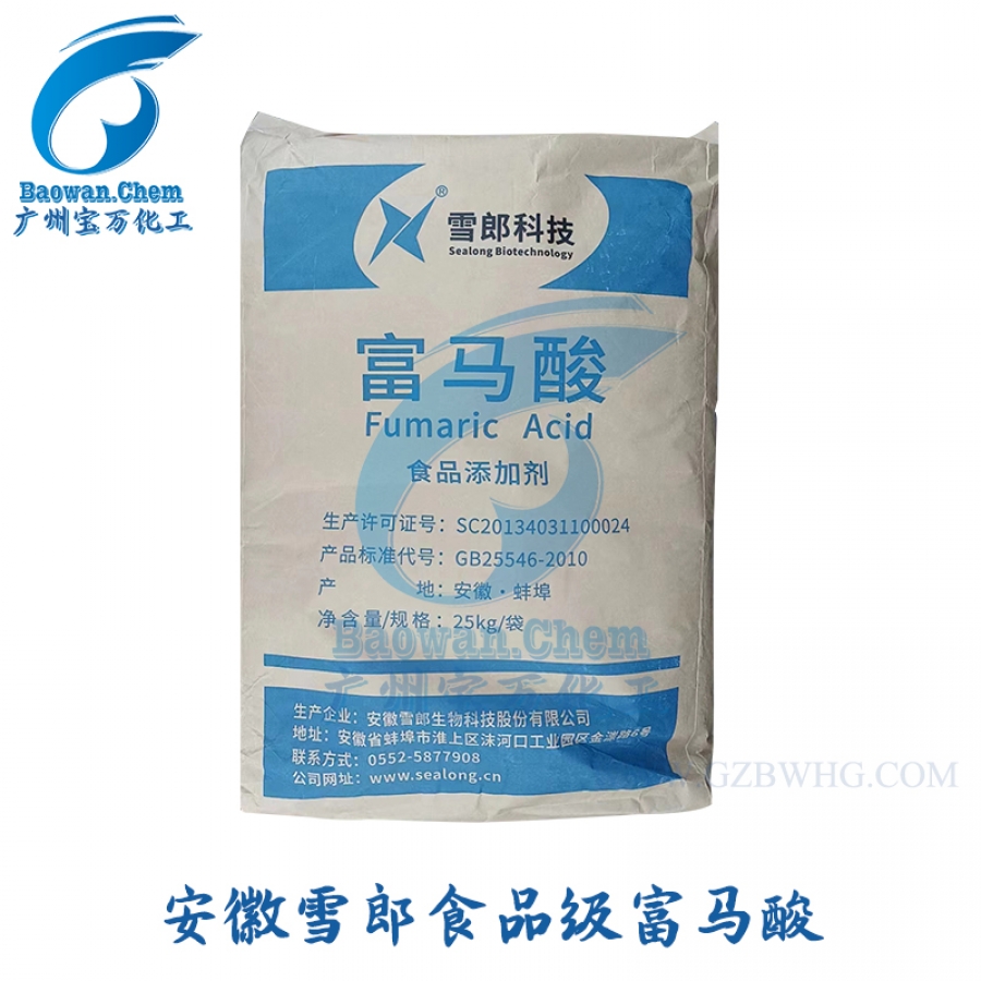 在食品中主要用于肉制品、魚肉制品加工等。富馬酸可作為酸度調(diào)節(jié)劑、酸化劑、抗氧化助劑、腌制促進劑、香料使用。本品有強緩沖作用,以保持水溶液在pH3.0左右,并對抑菌防霉有重要作用,同時,它有澀味,是酸味最強的固體酸之一,吸收率低,有助于延長粉末制品等的保存期。當富馬酸變?yōu)楦获R酸鈉后,水溶性及風味均更好。