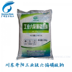 六偏磷酸鈉,分子式:(NaPO3)6,白色粉末結(jié)晶,或無色透明玻璃片狀或塊狀固體。易溶于水,不溶于有機溶劑。水溶液呈堿性。吸濕性很強,露置于空氣中能逐漸吸收水分而呈黏膠狀物。與鈣、鎂等金屬離子能生成可溶性絡(luò)合物。在食品和工業(yè)領(lǐng)域都具有廣泛用途。