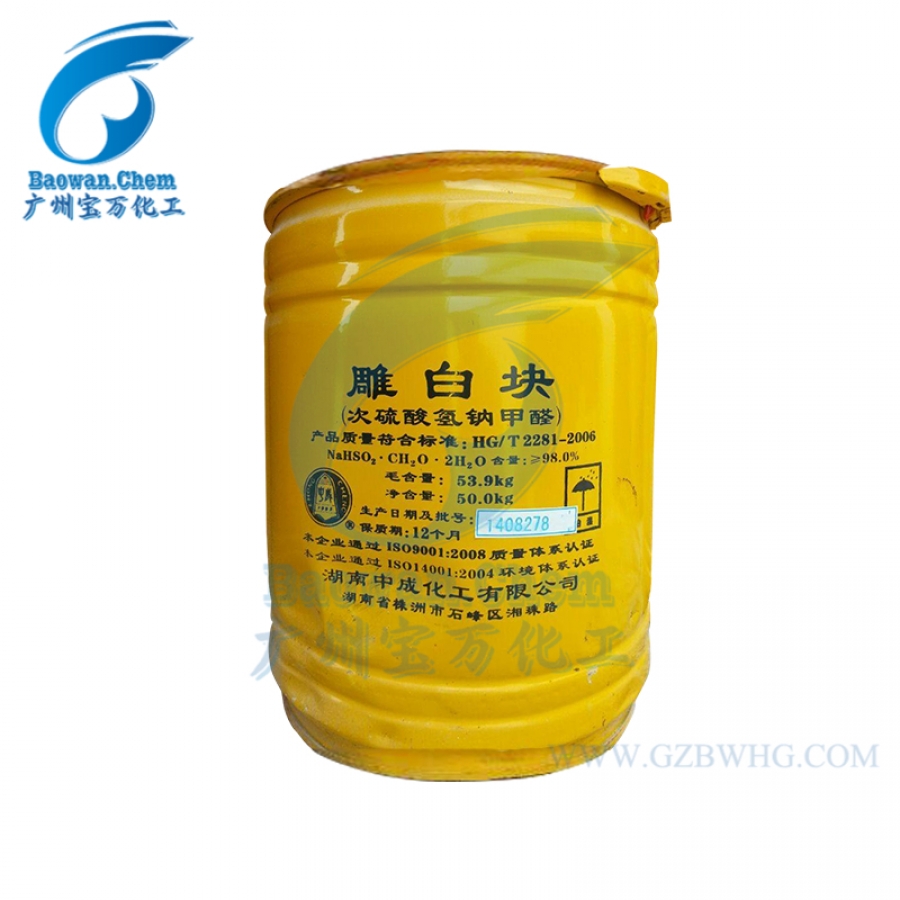 又稱雕白粉,系以福爾馬林結合亞硫酸氫鈉再還原制得,化學名稱為次硫酸氫鈉甲醛或甲醛合次硫酸氫鈉,分子式為NaHS02·CH20·2H20。呈白色塊狀或結晶性粉狀,易溶于水。常溫時較為穩(wěn)定,高溫下具有極強的還原性,有漂白作用。遇酸即分解,其水溶液在60℃以上就開始分解出有害物質,120℃下分解產生甲醛、二氧化硫和硫化氫等有毒氣體 。